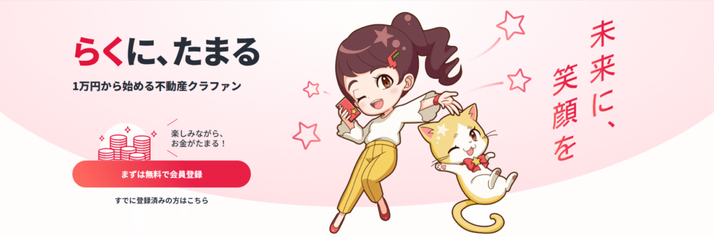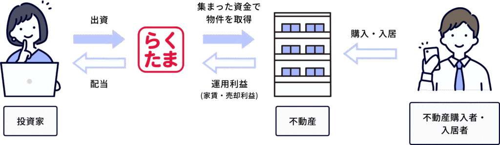 らくたまは、「みんなで少しずつお金を出し合って、不動産のオーナーになろう!」という仕組みのサービスです。これを「不動産クラウドファンディング」と呼びます。