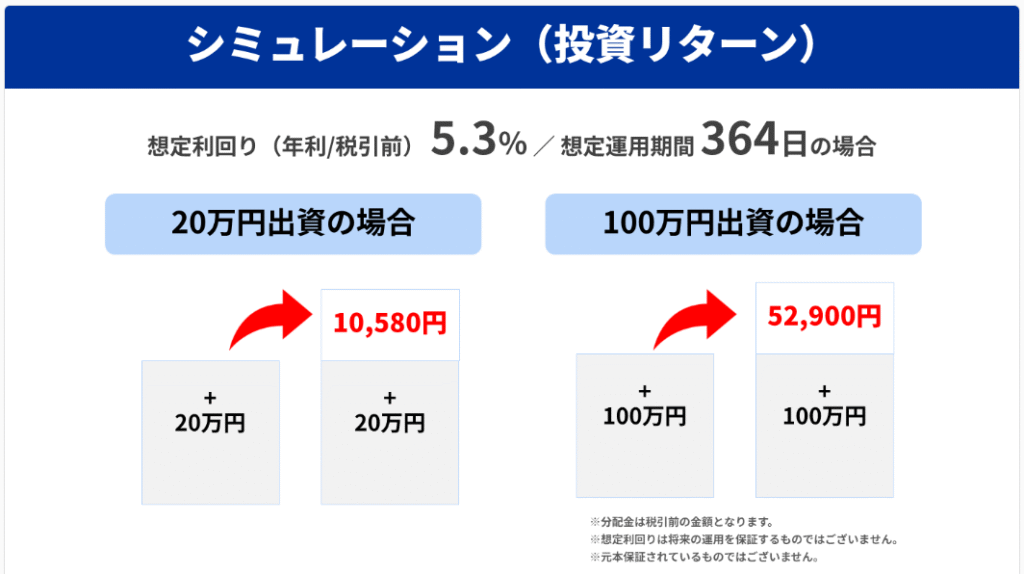 しかも、想定利回りは5%を超えます。10万円を投資すれば、1年後には約5,000円。ちょっと豪華なディナーが楽しめますね!