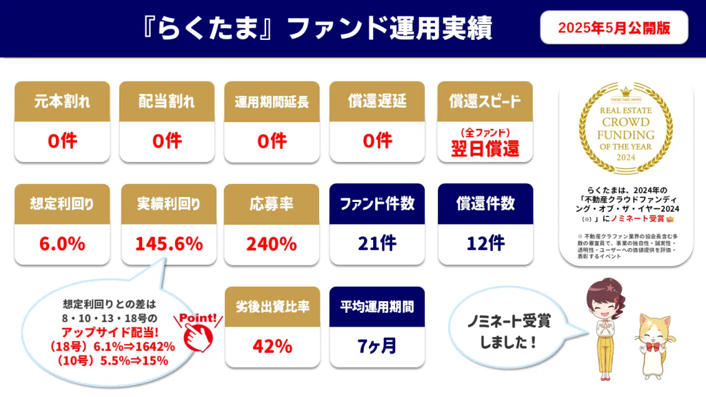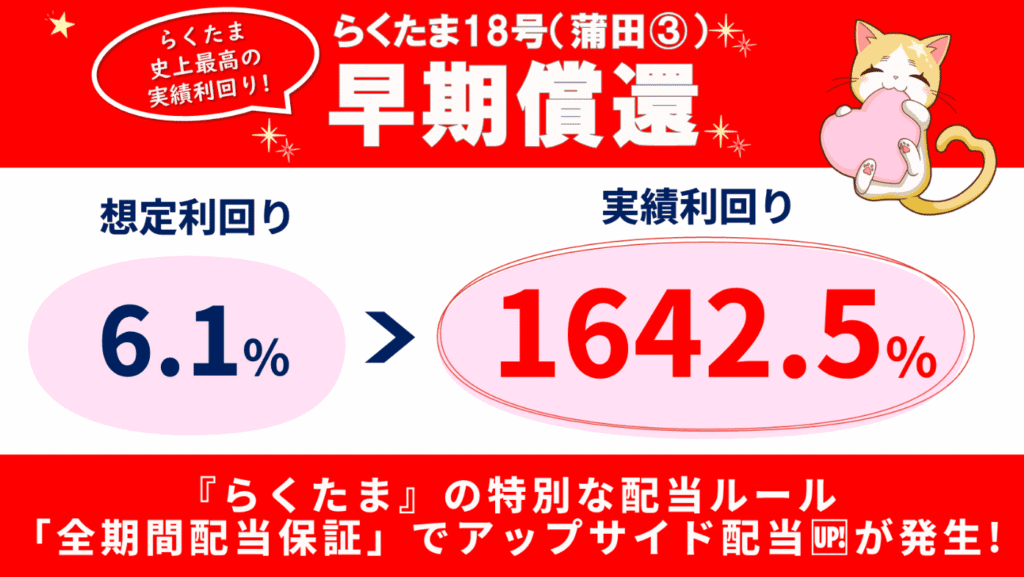 2025年8月時点では、全体の47%のファンドがアップサイド配当!さらにこれによりらくたま18号は想定利回り6.1%が実績利回り1642.5%になったことも話題に!