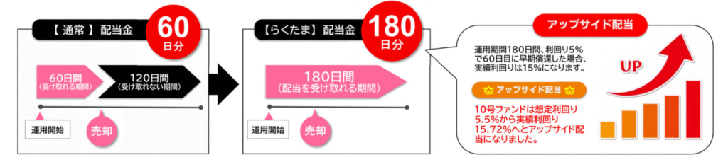 ただ、らくたまでは早く運用が終わったとしても本来の投資期間相当の配当金を受け取れます。これをアップサイド配当ともいうよ。