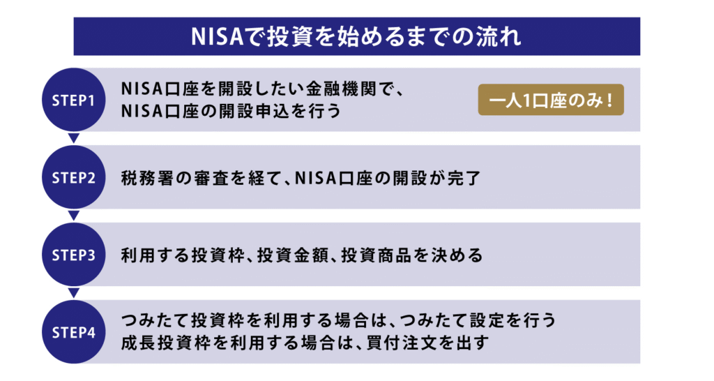 NISAは株式や投資信託などの金融商品を購入する制度であり、それらを扱っているのが証券会社だからです。具体的に以下がNISAで投資を始めるまでの流れです↓